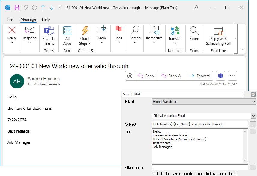 The date selection from Parameter 2 is used again in the e-mail text. As there can be only one result, the Global Variables.Parameter 2.Date is used directly in the e-mail text.