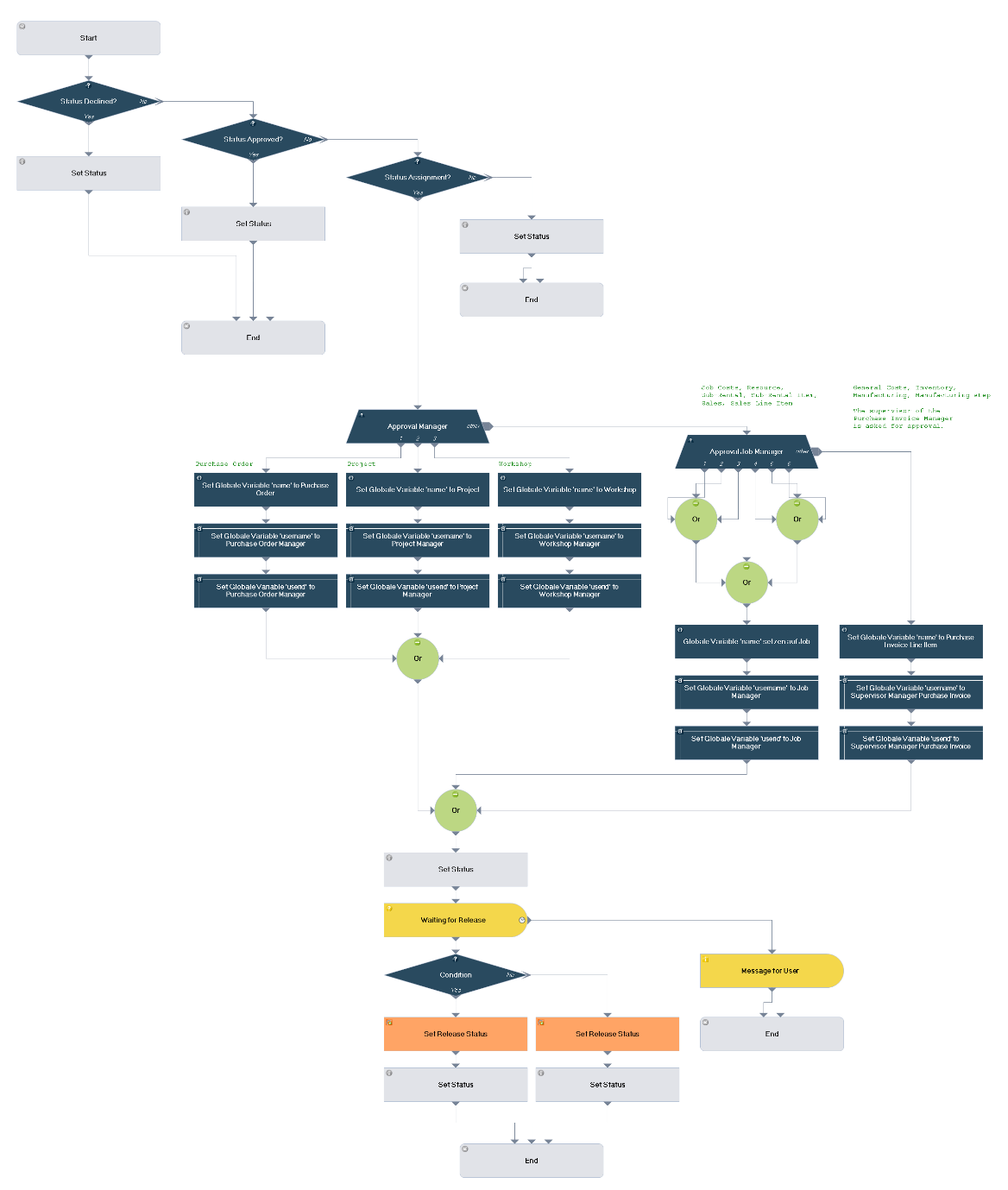 Three Workflows (Job Workflow, Purchase Order Workflow and Purchase Invoice Line Item Authorization Workflow) are supplied standard. You can activate the Workflow module, change parameters and use the three standard Workflows also without a license.