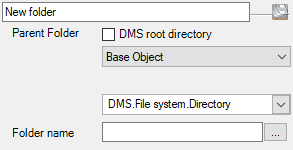 New Folder![]() | ![]() | A subfolder is created in the current DMS path. (By checking DMS Root directory, the directory stored in the Global Data Directory is used). The module (action) for reference to the current folder is selected, and the name of the folder to be created is defined. |