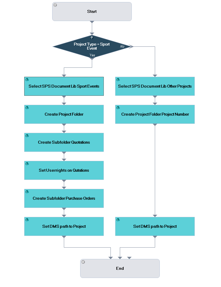 Various workflow modules are available for the automatic, individual storing of files in SharePoint folders and subfolders, as well as for assigning folder permissions. The trigger event DMS Project folder starts the workflow when a file (e.g. proposal, plan, etc.) should be stored in a certain area e.g. Projects.