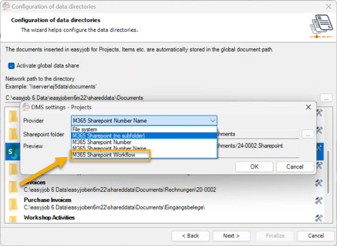 In the following example, another storage location is used, depending on the project type. In addition, subfolders are created and permissions assigned.