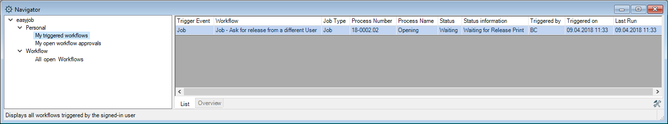 As soon as you have enabled the Workflow Engine module, you can trigger the Workflows assigned to processes and view the triggered Workflows as well as your open Workflow authorizations in the Navigator and easyjob Today. You need the Workflow Engine right if you want to create and manage workflows.