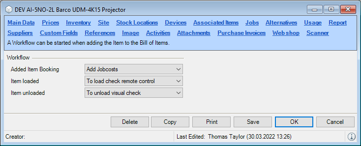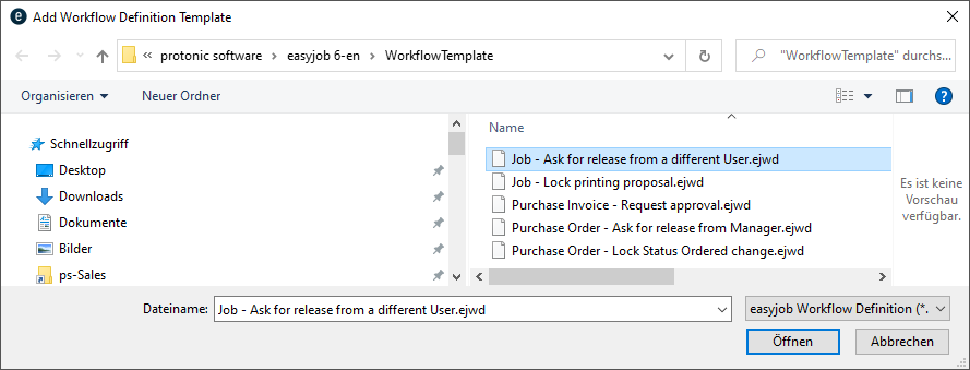 The functionality of the easyjob Workflow Engine module differs depending on the type of license. Without a license, you can edit parameters of existing Workflows. Workflows created individually by protonic software can be imported.